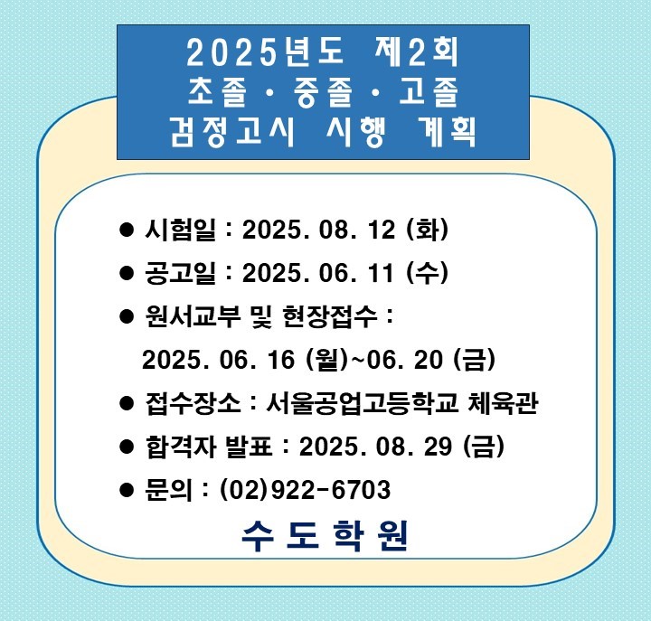 2025년도 제 2회 초졸,중졸,고졸 검정고시 시행 계획